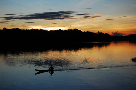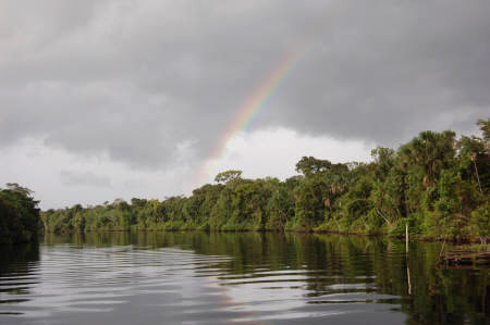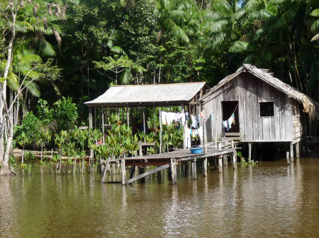 Nach anfänglichem Nebel haben wir jetzt Sonne und richtig sauberes Wasser und die Landschaften, die wie gemalt an uns vorbeiziehen, lassen uns wieder träumen. Wir stellen fest wie riesig groß dieses Amazonasgebiet doch ist und wir in den 6 Tagen ja nur einen Bruchteil davon sehen werden. Um neun Uhr kommen wir am Sägewerk, an der Mündung des Schwarzwasserflusses Mapuá an und machen da einen kurzen Stop zur Besichtigung und um noch ein paar Kleinigkeiten zu besorgen. Danach geht es weiter den Mapuá hinauf. Das schwarze Wasser sieht aus wie Coca Cola und ist ganz sauber. Die schwarze Farbe kommt von dem aus den Wäldern herausgespülten Sedimenten. Gegen Mittag kommen wir an unserem Zielpunkt Villa Amelia an. Hier wohnt eine Familie mit 4 Kindern.
